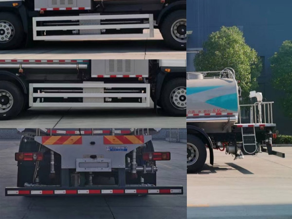 其它 | 1.該車裝備有罐體,噴水架等專用作業(yè)裝置,用于實現(xiàn)道路的清潔、灑水作業(yè);2.罐體總?cè)萘?.56立方米,有效容積:8.16立方米,罐體外形尺寸(長×寬×高)mm:3600×2400×1440,運輸介質(zhì):水,密度1000千克/立方米;3.儲能裝置種類/單體生產(chǎn)企業(yè)/總成生產(chǎn)企業(yè):磷酸鐵鋰蓄電池/寧德時代新能源科技股份有限公司/寧德時代新能源科技股份有限公司;4.驅(qū)動電機類型為永磁同步電機,額定功率為105kW,峰值功率為165kW;5.ABS型號/生產(chǎn)企業(yè):CM4XL-4S/4M/廣州瑞立科密汽車電子股份有限公司;6.側(cè)防護材料:鋁合金,連接方式為螺栓連接;后防護材料:Q235,連接方式:螺栓連接,后防護斷面尺寸:60×120(mm),離地高度為430mm;7.該車選用4500mm軸距,整車長度(mm)/前伸(mm)/接近角(°)對應關(guān)系:9500/1000/6,9400/900/6,9100/600/11,8500/0/11,選裝前噴水架,前置電子水炮. | ||