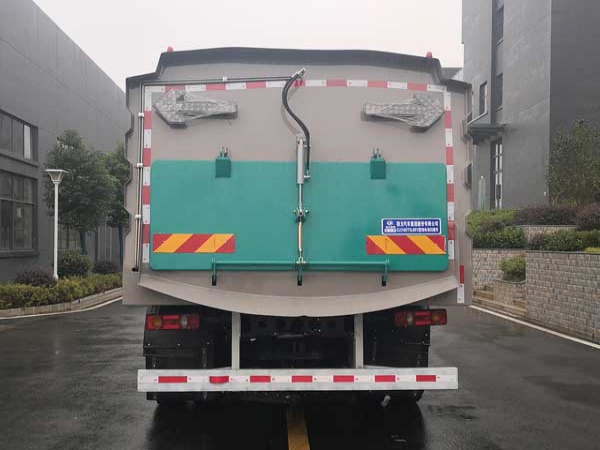 (1) 清水箱充分利用了車載空間,容積大,可達3m3。垃圾箱采用單層不銹鋼結構,傾翻卸料。