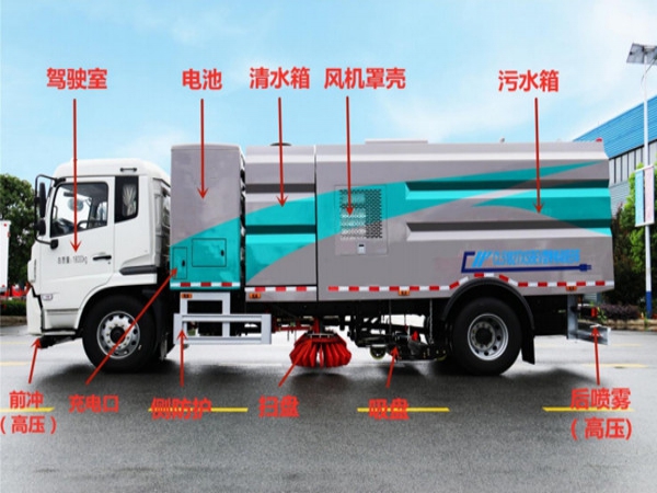 該洗掃車采用純電動二類底盤改裝、風(fēng)機(jī)、清水箱、垃圾箱、左右立掃、掃盤降塵系統(tǒng)、左右高壓側(cè)噴高、吸盤內(nèi)置高壓主噴桿、氣動系統(tǒng)、液壓系統(tǒng)、專用裝置電控系統(tǒng)和副車架等改裝而成。